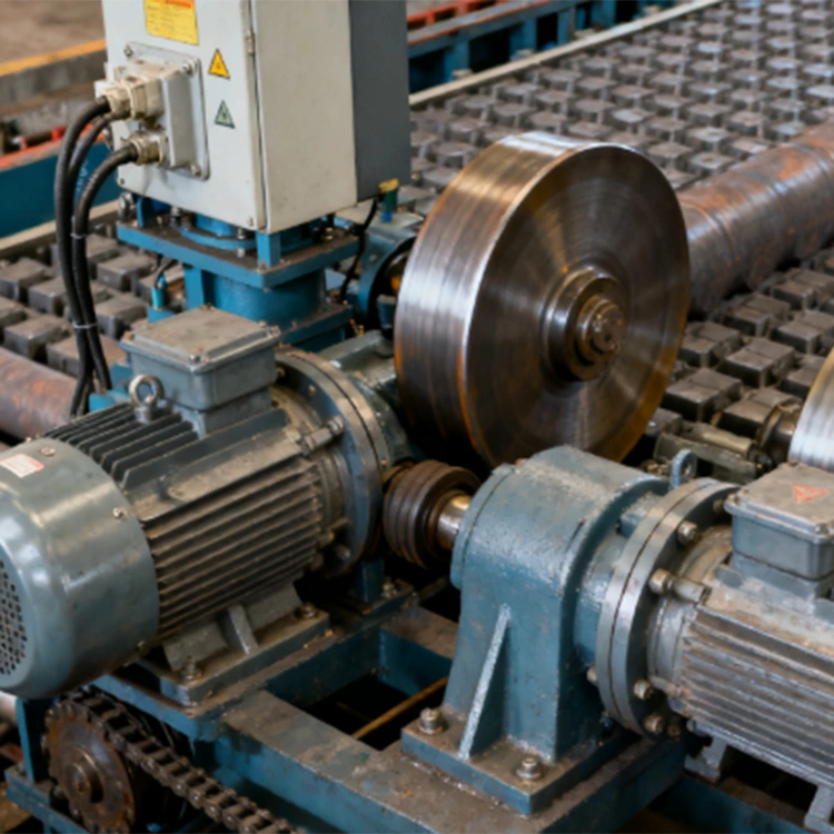 Drivsystem: Systemet består av en motor, reducering och drivkedja och fungerar smidigt och kontrollerar rullarnas hastighet och riktning exakt, vilket säkerställer en ordnad transport av det rullade materialet.